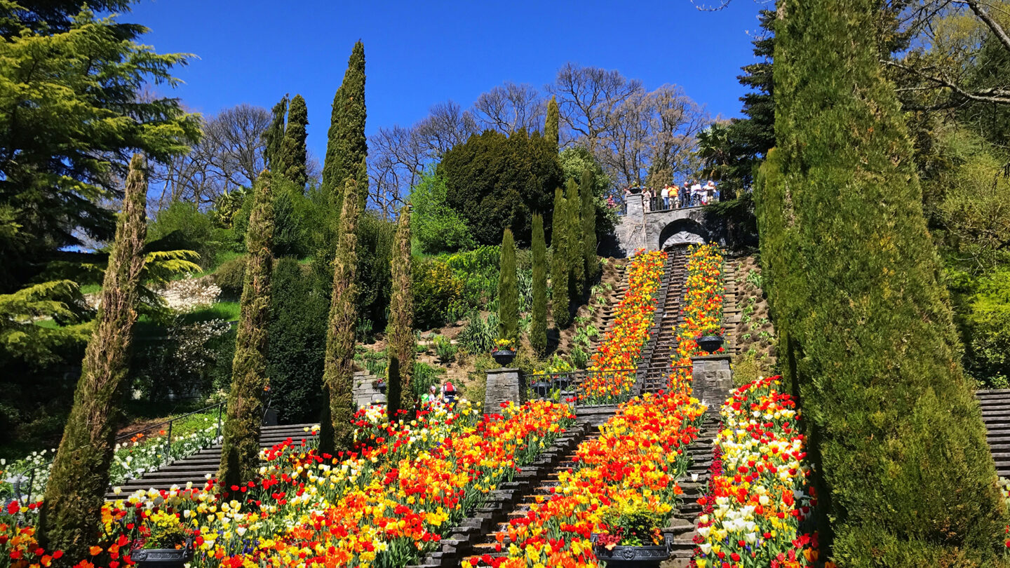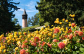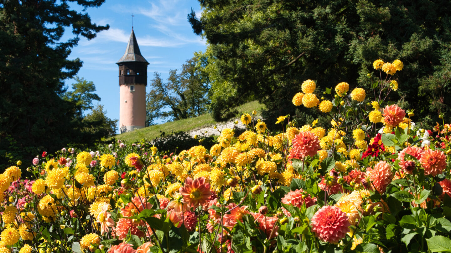 Die sonnenverwöhnten Dahlien zeigen sich in allen erdenklichen Farbschattierungen, Formen und Grössen. Die Beete sind grosszügig angelegt und nach Wuchshöhe gestaffelt, von den kleinsten Mignon-Dahlien bis zu den riesigen 2-Meter hohen Sorten.
